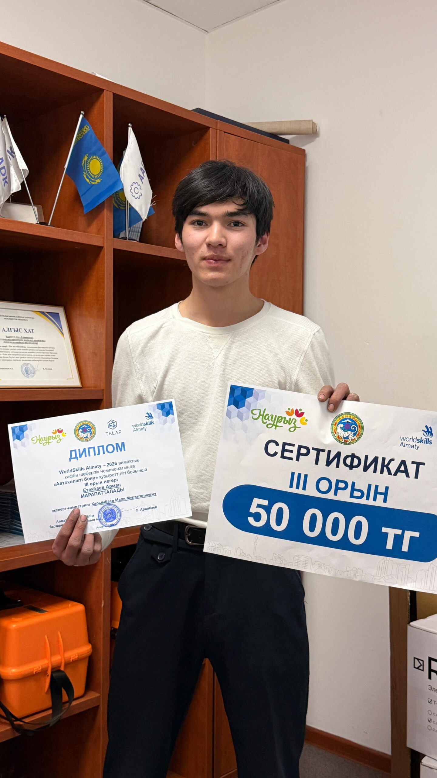 Студент «Алматинского автомобильно-дорожного колледжа» Арман Етекбаев занял III место в компетенции «Покраска автомобиля» на региональном чемпионате WorldSkills Almaty 2026. Его результат стал возможен благодаря настойчивости и поддержке эксперта-компатриота Мади Мурзагалиевича Карымбаева. Поздравляем Армана и благодарим наставника за вклад в развитие молодых специалистов!